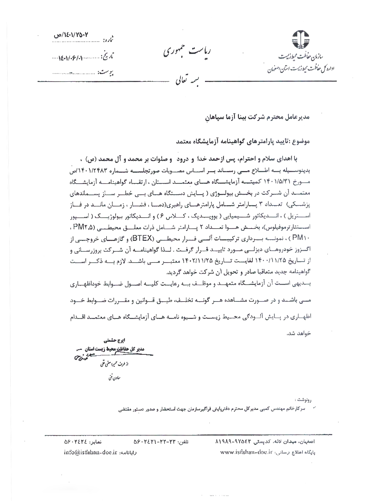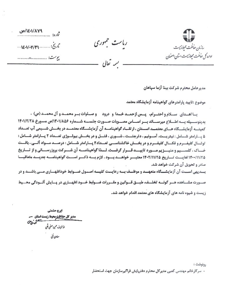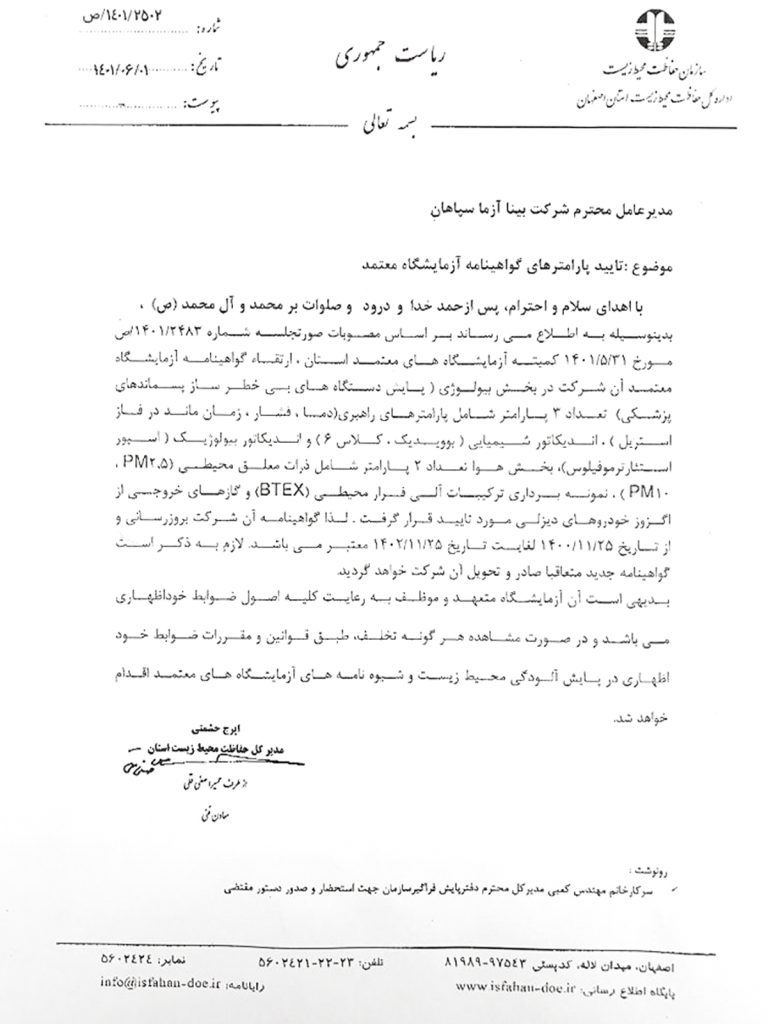 گواهینامه تائید صلاحیت آزمایشگاه همکار از اداره کل استاندارد استان اصفهان