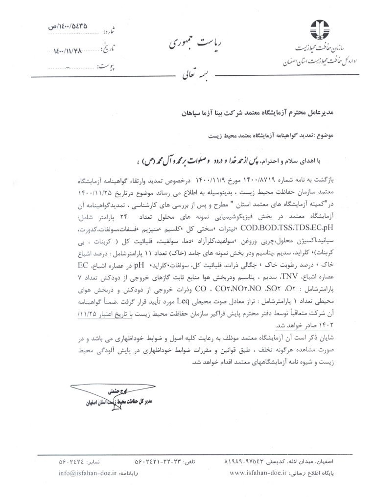 گواهینامه آزمایشگاه معتمد از سازمان حفاظت محیط زیست