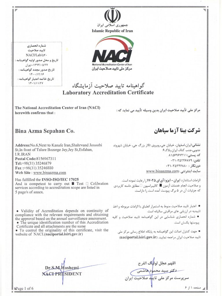 گواهینامه تائید صلاحیت ISO/IEC ۱۷۰۲۵ از مرکز ملی تائید صلاحیت ایران